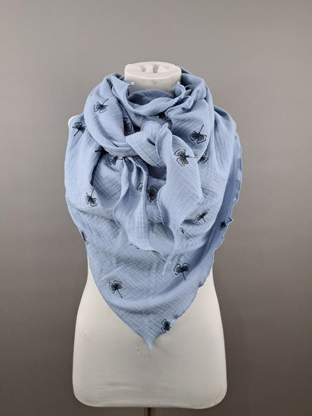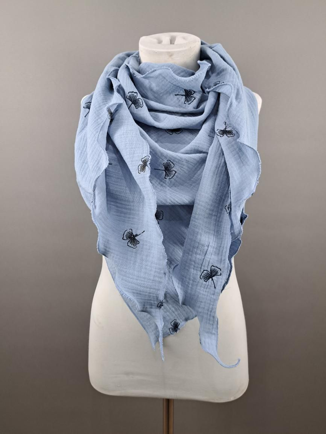 Musselin hellblau mit Stickerei Ginko